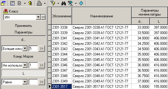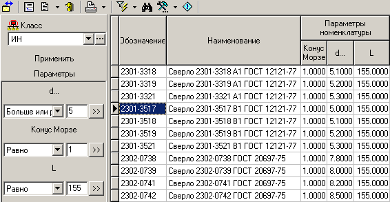 Помимо поиска номенклатуры по параметрам и эскизам в системе существует гибкий механизм быстрого поиска, который является разновидностью поиска по параметрам, но работает значительно быстрее, за счет того, что пользователь здесь может задавать множественные начальные и граничные условия поиска. Данный режим вызывается из многих режимов системы, где требуется подбор номенклатуры по параметрам, либо из главного меню системы