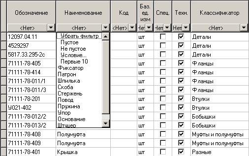 Под строкой наименований колонок выводятся значения для фильтра. Нажатие на эту строку также вызывает режим работы с фильтром.