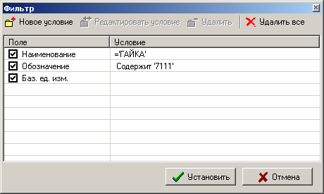 Над разными полями выполняется логическая операция «И». После ввода значений фильтра формируется окно вида: