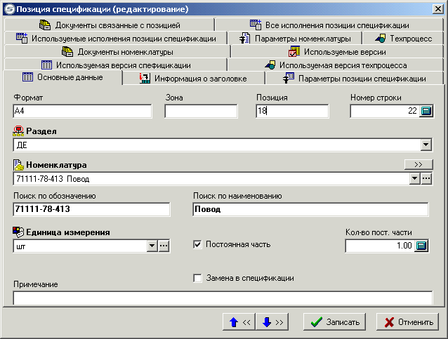 Флаг «Постоянная часть» указывает на то, что данная запись относится либо к единичной спецификации (если данная спецификация не имеет исполнений), либо к постоянной части групповой спецификации, что будет подробно показано в разделе 4.14.