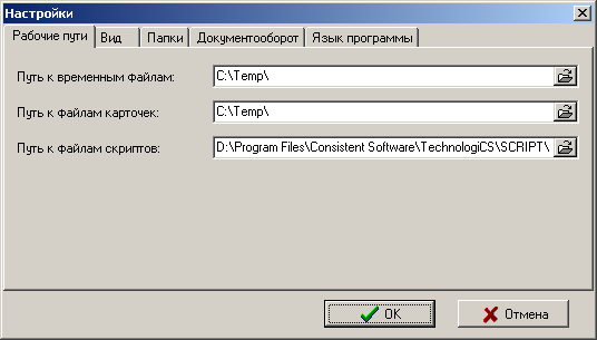 На закладке «Рабочие пути» указываются пути к папкам, где будут размещаться временные файлы, необходимые для работы системы TechnologiCS, путь к папке, где будут кэшироваться файлы карточек для ускорения работы системы в сети и путь к папке, куда будут временно выгружаться скрипты.