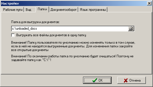 На закладке «Папки» находятся настройки пути к папке для выгрузки документов подсистемы документооборота: