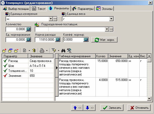 При последующем редактировании вспомогательного материала на закладке «Реквизиты» вводятся следующий набор реквизитов для технологической документации: