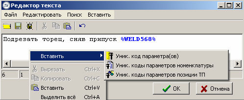 В режиме ведения технологии, сюда можно вставлять не только коды параметров из справочника 2.3.1, коды параметров номенклатуры (см. 3.3.2) но и коды параметров позиций ТП, если такие параметры введены, как это показано в разделе 5.4.10.