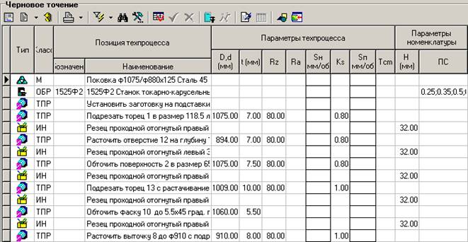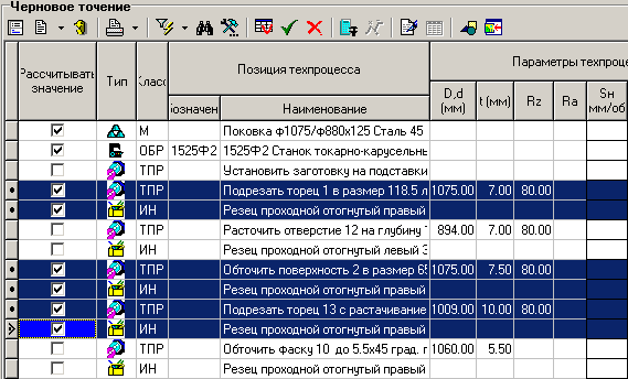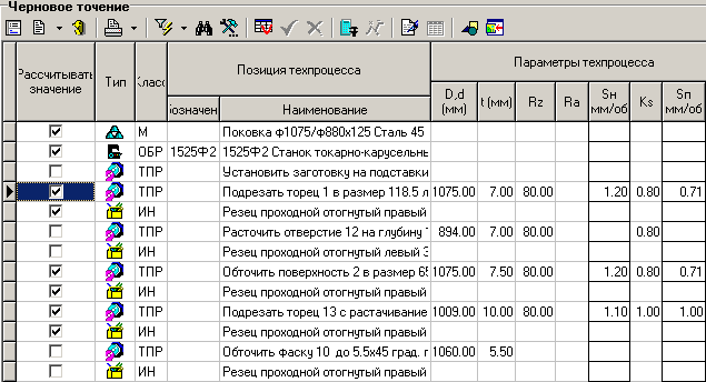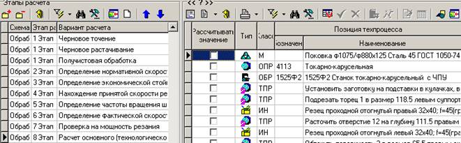 в правом – позиции техпроцесса, параметры и результаты расчетов.