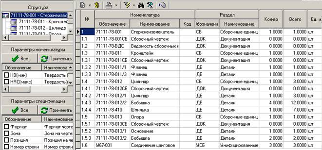 При этом для удобства в левой части экрана помимо списков параметров номенклатуры и параметров техпроцессов выводится окно структуры изделия, а первая колонка области отчета представляет собой нумерованный список позиций итоговой спецификации.