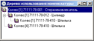При перемещении по строкам таблицы области редактирования в этом окне будет строиться дерево применяемости текущей позиции в узлах изделия с указанием количества в узле. Выдается также количество узлов в каждой ветви дерева. По цифрам количества узлов в ветвях и количества позиций в узлах можно рассчитать цифру общего количества позиции во всем изделии или в каждом конкретном узле.
