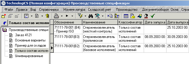 Производственные спецификации (здесь и в дальнейшем ПСп) служат для ведения перечня номенклатурных позиций производственного заказа, для оперативного изменения его состава, последовательности изготовления позиций, а также для изменения вариантов изготовления позиций. Ведение ПСп осуществляется в режиме «Производство»- «Производственные спецификации». При запуске этого режима выводится окно следующего вида: