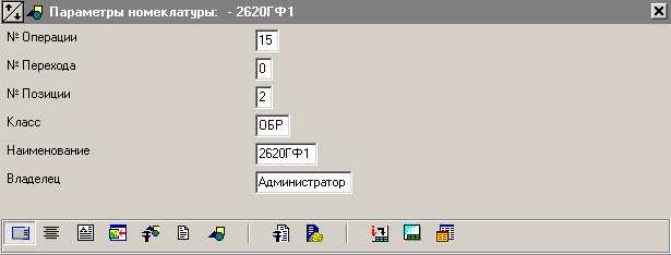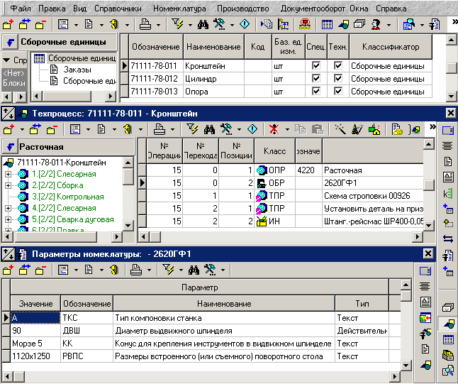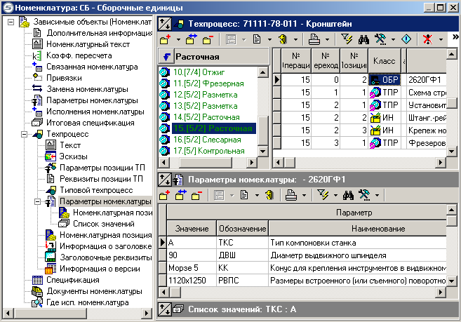 Так, например, можно встать в номенклатурном справочнике на «71111-78-011 Кронштейн», включить режим «Показать зависимые объекты», выбрать в зависимых объектах его техпроцесс, найти в техпроцессе станок «2620ГФ1», у него включить режим «Показать зависимые объекты», в котором правой клавишей мыши из контекстного меню выбрать раздел «Номенклатурная позиция» и «Параметры номенклатуры». Таким образом, выбрав номенклатурную позицию можно не только работать с ее техпроцессом, но и просматривать/редактировать параметры оборудования, на котором данная номенклатура должна изготавливаться.