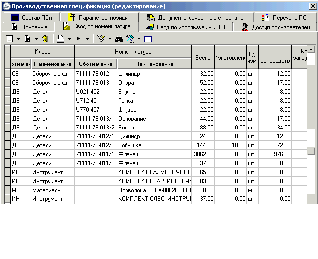 В этой форме выводится перечень номенклатурных позиций, сведенный по всей ПСп с расчетом общего количества (графа «Всего»).