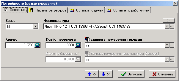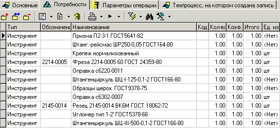 На этой закладке выводится список всех необходимых ресурсов для выполнения операции в следующем виде: