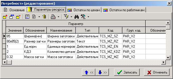 На закладке «Параметры ресурса» можно откорректировать заданные в техпроцессе параметры и добавить новые (если это необходимо) в следующей форме:
