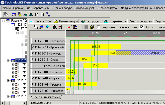 Дата и время окончания изготовления входящих не должно быть больше даты начала изготовления узла, в этом случае линия связи подсвечивается красным цветом как показано ниже.