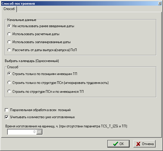 · Флаг «Строить по структуре ПСп и по имеющимся ТП». Этот способ комбинирует возможности двух предыдущих, а именно: Для позиций имеющих ТП использовать данные о длительности из ТП, а при его отсутствии использовать данные параметра TCS_T_IZG.