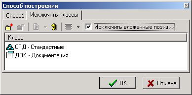 Если для построения выбраны способы «Строить только по структуре ПСп (игнорировать трудоемкость)» или «Строить по структуре ПСп и по имеющимся ТП», то в окне «Способ построения» появляется закладка «Исключить классы», на которой задается список классов, которые не включаются в циклограмму (например, покупные, комплектующие и т.д.).
