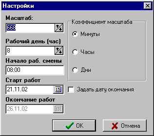 · В поле «Коэффициент масштаба» выбирается единица измерения масштаба, т.е. в каких единицах будет построена циклограмма.