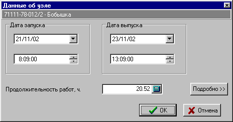 Здесь можно точно задать дату и время запуска и дату и время выпуска номенклатурной позиции, или же изменить длительность выполнения операции. Нажатие кнопки «Подробно» выводит окно следующего вида: