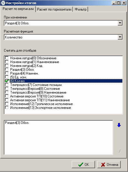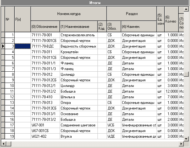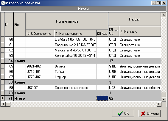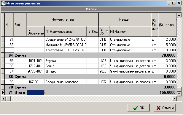 А если выбрана расчетная функция «Сумма», то в каждом из разделов спецификации можно подсчитать общее количество позиций на данную сборочную единицу.