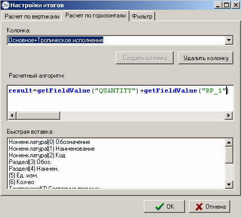 Закладка «Расчет по горизонтали» служит для создания новых столбцов и проведения расчетов в них, на основе данных таблицы.