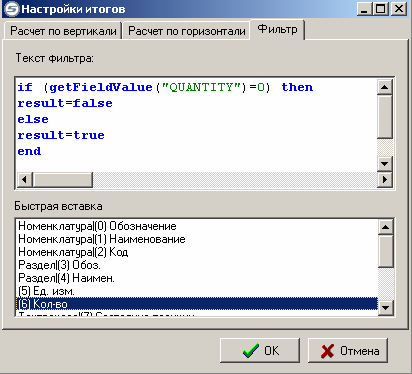В окне «Текст фильтра» задаётся программа на языке Visual Basic, определяющая будет видима или не видима строчка в таблице. Результат работы программы записывается в переменную «result». Здесь в «result» следует записать true или false. Возможности языка в данном контексте такие же, как и в закладке «Расчет по горизонтали». Включение/отключение фильтра осуществляется в контекстном меню работы данного режима.