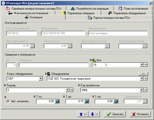 · «Основные» отображает основные данные сведения о заказе, детали, операции, используемом оборудовании.