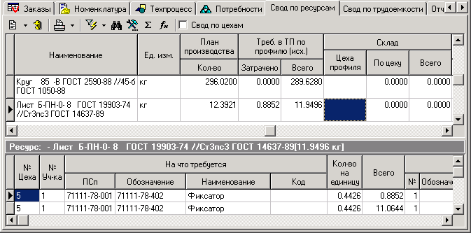 В верхнем окне выводится свод по ресурсам, а в нижней части – те позиции, где используется ресурс. Поднятие флага «Свод по цехам» осуществляет свод по ресурсам в разрезе подразделений.