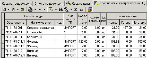 Данная закладка предназначена для отображения свода по номенклатуре, которая изготавливается по одной версии технологии.