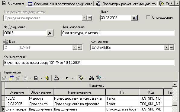 · В нижней части закладки «Основные» приводится перечень параметров используемых для данного документа по умолчанию и определяемых в настройках для данного типа расчетных документов.