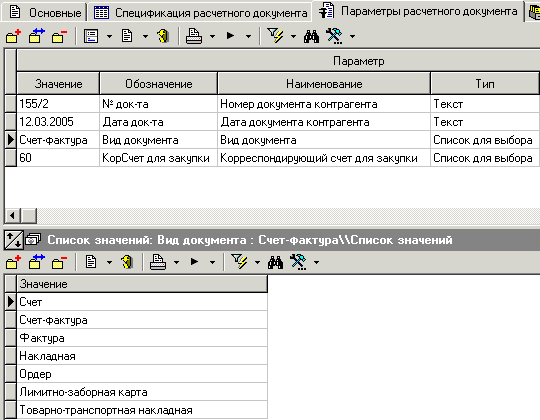 На закладке «Параметры расчетного документа» ведется общий перечень параметров, как задаваемый для расчетного документа по умолчанию при настройке системы (см.10.3.2), так и формируемый вручную на данной закладке. Диалоговое окно для редактирования списка параметров приведено на следующем рисунке.