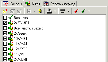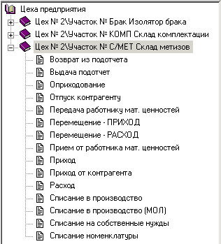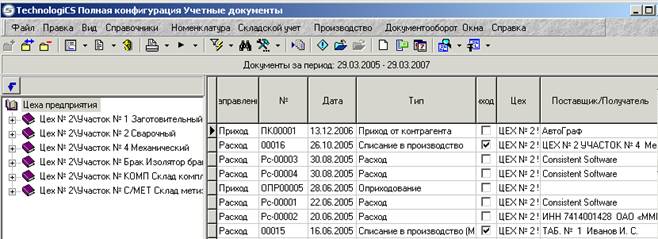 В левой части данного окна отображается классификатор, состоящий из цехов предприятия и типов зарегистрированных в системе учетных документов (см.10.3.1).