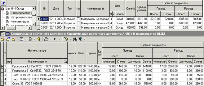 Так, на рис. видно, что на заказ А необходимо материалов на сумму 3810, поступило на сумму 3210 а израсходовано в производство на сумму 3005.