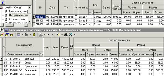 По мере изготовления деталей, в производстве оформляются учетные документы на приход готовых деталей, что отображается в колонке «Учетные документы»-«Приход» в количественном и суммовом выражении.