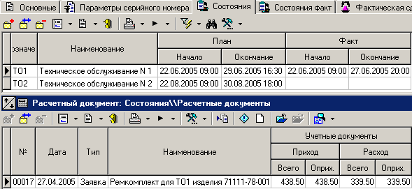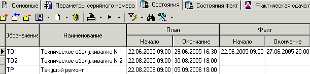 отображается перечень состояний и даты планового и фактического выполнения конкретного состояния. Состав информации на этих закладках одинаков, разница заключается в том, что на закладке «Состояния» можно добавлять элементы в список состояний, формируя таким образом план обслуживания и ремонтов серийных номеров,