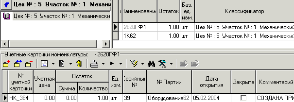 Таким образом, ведение конкретного экземпляра (серийного номера) станка начинается с учетного документа на приход (см.10.6.2), после чего в картотеке данного цеха/участка появляется учетная карточка данного оборудования (см.10.5).