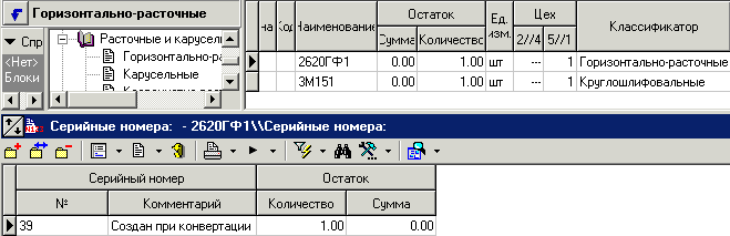 После того, как учетный документ оприходован (см.10.6.2), информация о станке попадает во все учетные регистры системы, и дальнейшее ведение серийного номера осуществляется с помощью зависимого объекта «Серийные номера», вызываемого из режима «Остатки».