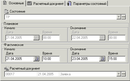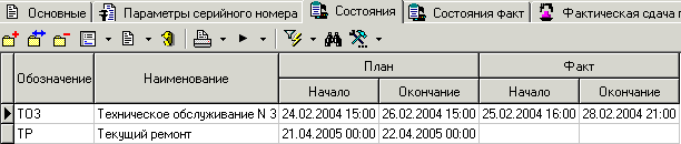 отображается перечень состояний и даты планового и фактического выполнения конкретного состояния. Состав информации на этих закладках одинаков, разница заключается в том, что на закладке «Состояния» можно добавлять элементы в список состояний, формируя таким образом план обслуживания и ремонтов оборудования,
