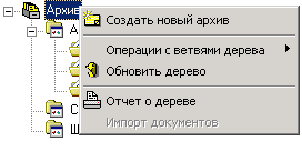 Для создания нового архива следует установить курсор на узел дерева «Архив» (самый верхний) и нажать правую кнопку мыши. Появится контекстное меню следующего вида: