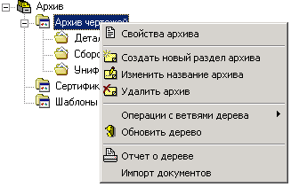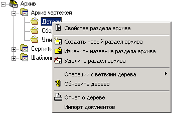 Для выполнения операций с созданным разделом архива следует установить курсор на его наименование в дереве и нажать правую кнопку мыши. Появится контекстное меню следующего вида: