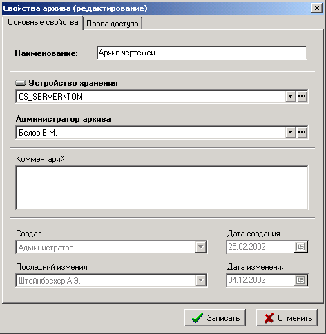 · В поле «Наименование» вводится (редактируется) наименование архива.