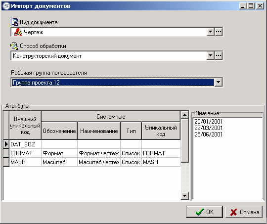В поле «Вид документа» нужно задать вид импортируемых документов. В поле «Способ обработки» - способ обработки вида документа. В поле «Рабочая группа пользователя» - задать группу, имеющую доступ к документу. Система не допускает импорта за один сеанс разнородных документов, т.е. за один раз должны загружаться документы, имеющие общие: вид документа, способ обработки и рабочую группу.