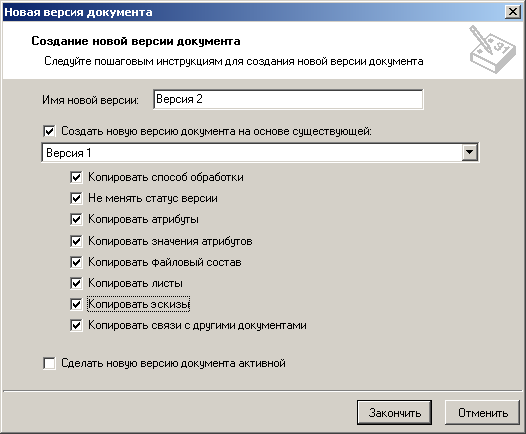 Если флаг «Создать новую версию на основе существующей» не установлен, то запускается мастер создания документа, начиная с этапа заполнения атрибутов версии. Если же в виде документа не заданы атрибуты версии, то новая версия создается без диалога.