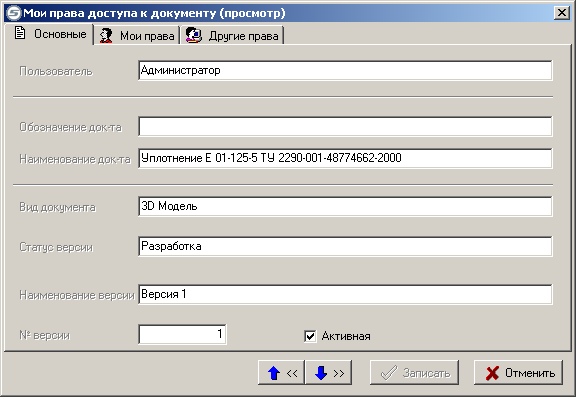 В нижней части экрана задаются индивидуальные права пользователей на доступ к документу. Если пользователь указан индивидуально, то ему права назначаются исходя из этого, вне зависимости от того, в какую группу и с какими правами он входит, т.е. этот список имеет более высокий приоритет.