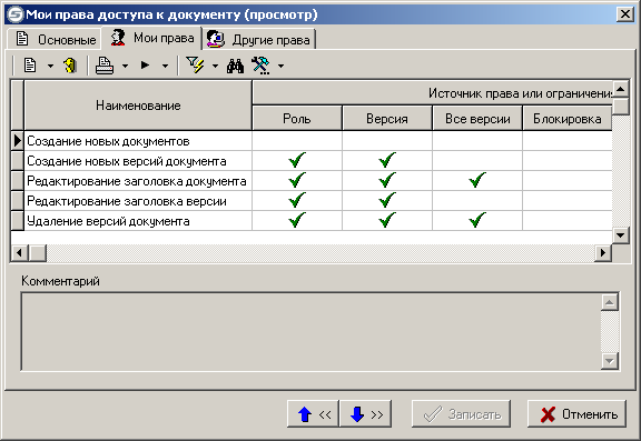 Пункт меню «Мои права доступа к документу» выводит диалоговое окно следующего вида: