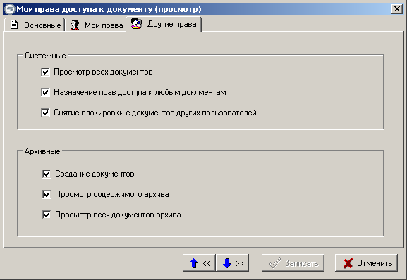 На закладке «Другие права» выводится дополнительный набор прав пользователя, заданных в администраторе, или полученных при назначении прав доступа к определенному архиву.