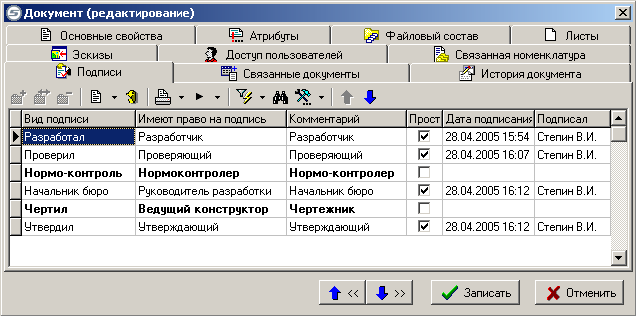 где заносится история подписания каждой версии документа.