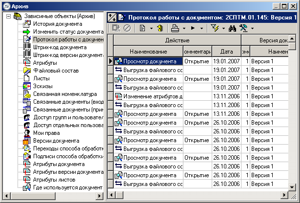 этом режиме предоставляется информация об истории движения версии документа.