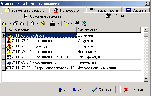 На закладке «Объекты» заносятся объекты, связанные с этапом проекта.