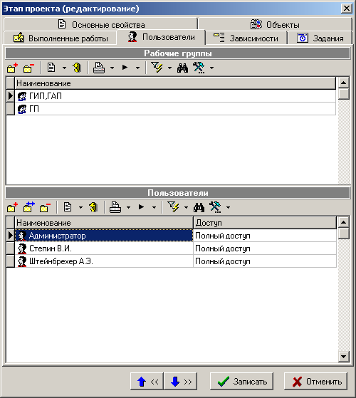 В поле «Пользователь» указывается пользователь. В поле «Доступ пользователей» из списка выбирается вид доступа пользователя к этапу проекта: