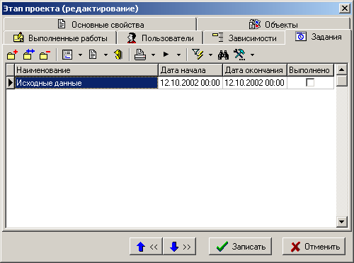 На этой закладке «Задания» ведется список заданий участникам проекта, фиксируется их выполнение, а также дается доступ к этапу проекта.