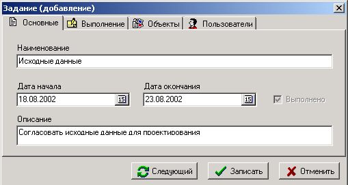 Значения даты начала и даты окончания задания, при добавлении нового задания, присваиваются по умолчанию исходя из значений дат начала и окончания этапа, к которому относится задание.